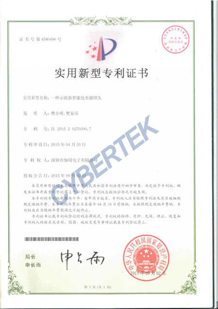 恭贺本公司荣获《实用新型专利证书》之“一种示波器智能化有源探头”